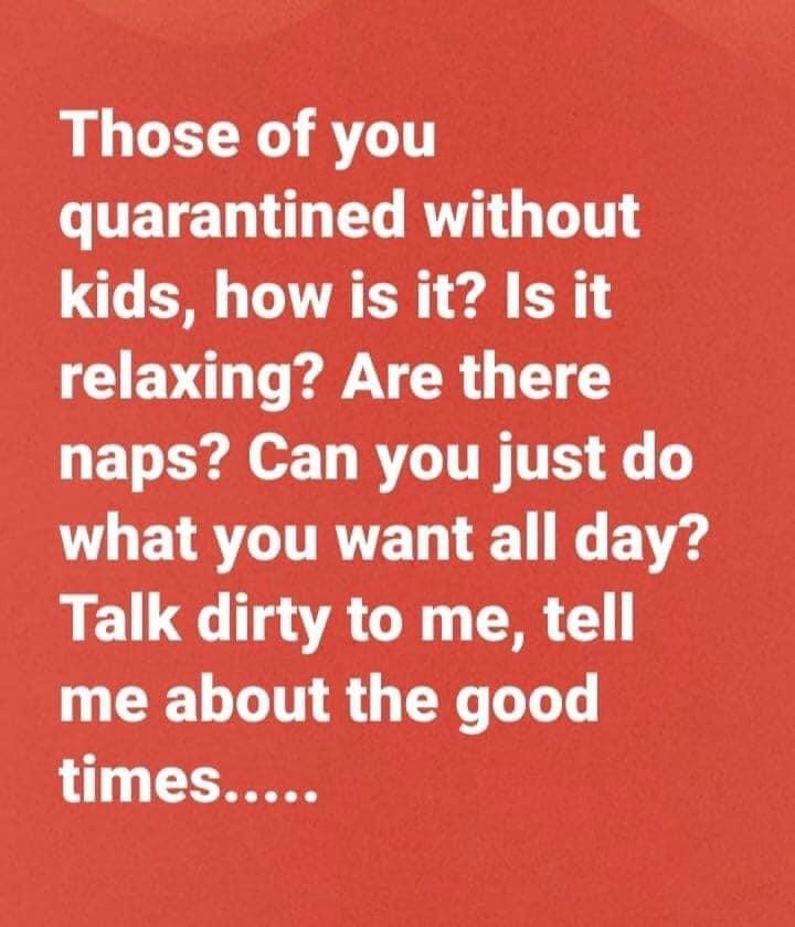 Today I have uttered the phrases, I’m telling Dad!!!!!!, Do not lick me!!!, and Keep your shirt on!!! As a sidebar, we are all about to find out just how ugly we are. In a few more weeks, I’m gonna see what my natural hair color is….haven’t seen it in about 20 years so this could get interesting. Stay safe out there. Drink of the day, margarita – no salt!