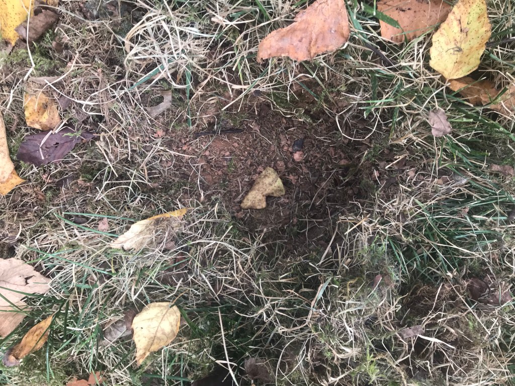 Bunny update: my little friends (I think there are two but there could be a tiny runt hiding) are still alive and thumping. This morning I went to check on them and they were only partially covered. This could be a sign from the mom they need to get a job and move on already. Freeloaders. She’s over this mom business. Nevertheless, I carefully covered them. I think it’s better to cover them than have my crazy dog bully them. The pictures aren’t great but here they are.